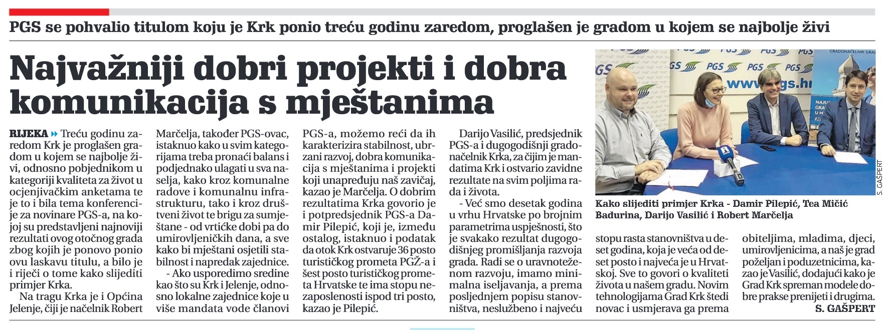 Treću godinu zaredom Krk je proglašen gradom u kojem se najbolje živi, odnosno pobjednikom u kategoriji kvaliteta za život u ocjenjivačkim anketama te je to i bila tema konferencije za novinare PGS-a, na kojoj su predstavljeni najnoviji rezultati ovog otočnog grada zbog kojih je ponovo ponio ovu laskavu titulu, a bilo je i riječi o tome kako slijediti primjer Krka.